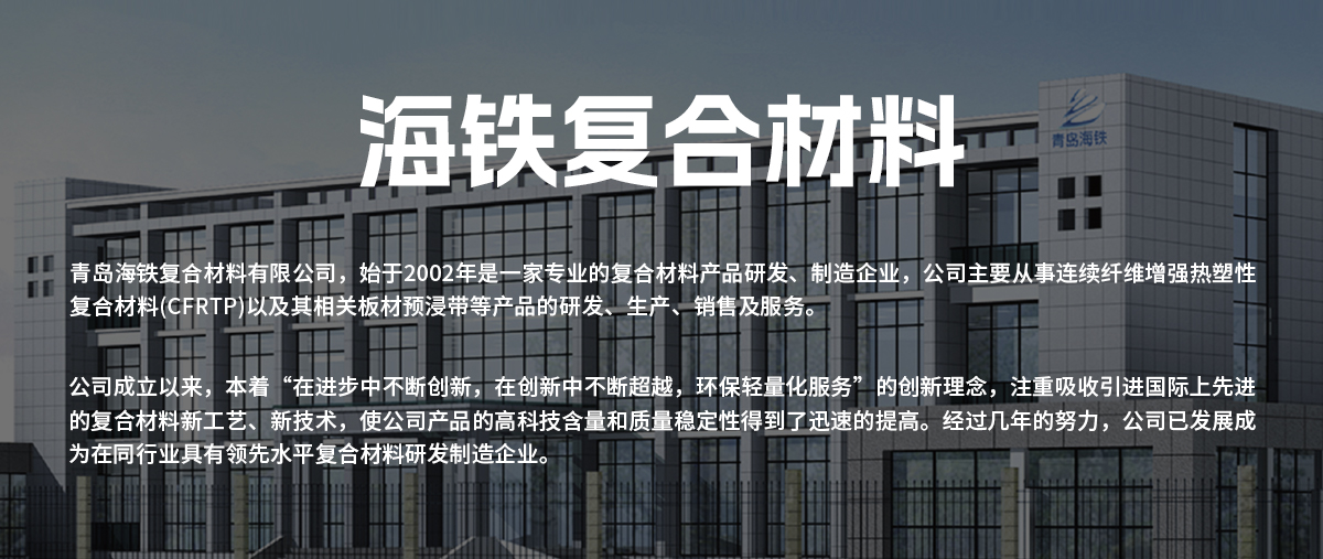 青岛海铁复合材料有限公司,始于2002年是一家专业的复合材料产品研发、制造企业,公司主要从事连续纤维增强热塑性复合材料(CFRTP)以及其相关板材预浸带等产品的研发、生产、销售及服务。